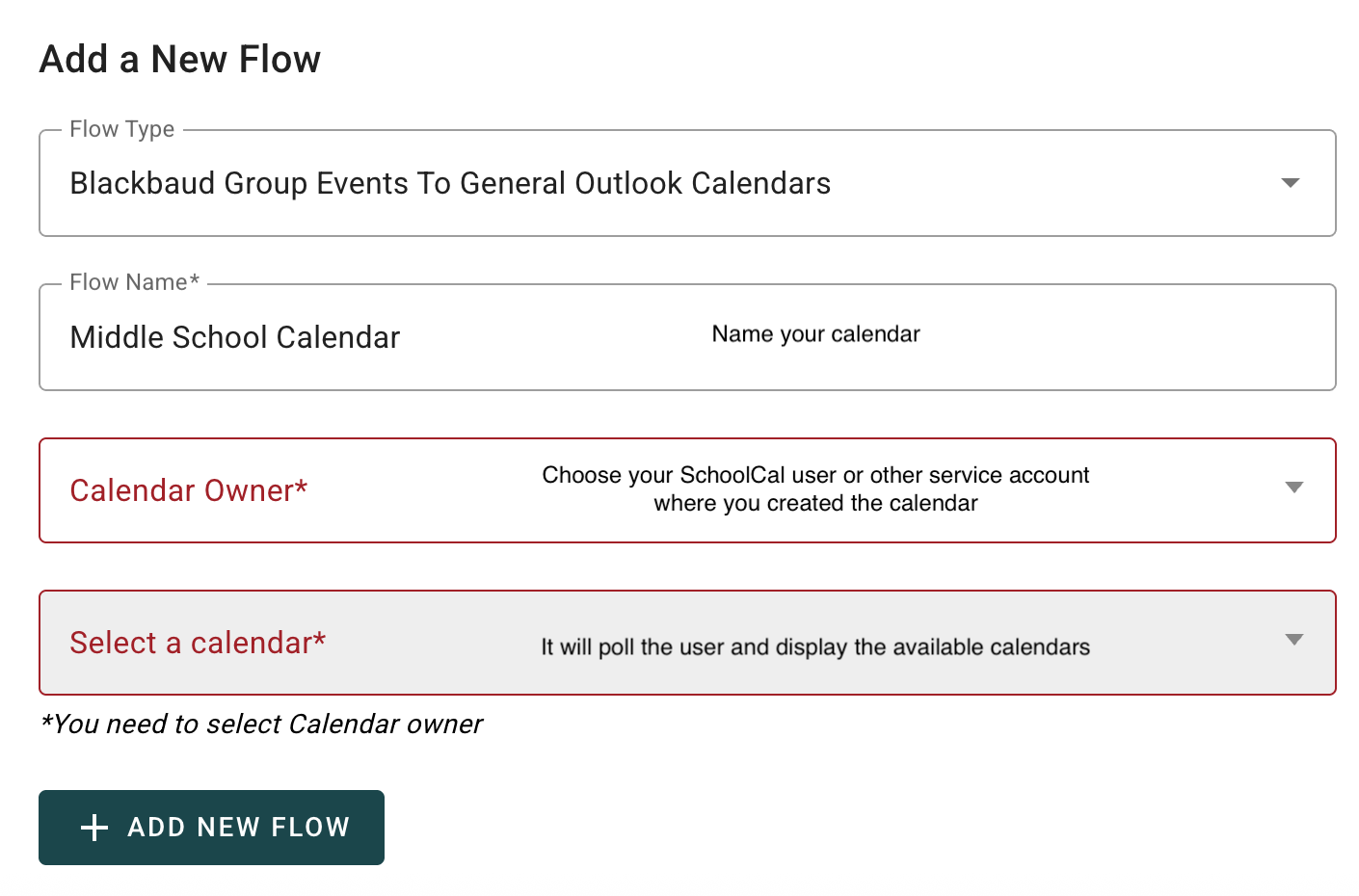 This pipeline will allow you to push events from your SIS to a Outlook calendar that you can then share with various audiences, as needed. You may create multiple flows with events from several event types. For example, you may want a Middle School calendar that includes not only Middle School events but also All School events as well as holidays and days off. Keep in mind that events are ONLY written to the general calendar and not added to individual user calendars.